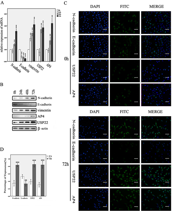 Figure 2: USP22 and AP4 expression in TGF-β1-induced EMT cells. (A, B) RT-qPCR and western blot analysis of USP22 and AP4 expression in SW1116 cells induced with TGF-β1 for 0 h, 24 h, 48 h and 72 h. Gradually increases in the expression of N-cadherin, vimentin, USP22 and AP4 and decreases in the E-cadherin expression were observed at both the genetic and protein levels. (C, D) Immunofluorescence analysis of the expression of N-cadherin, E-cadherin, USP22 and AP4 in SW1116 cells induced by TGF-β1 for 0 h and 72 h. The percentages of N-cadherin-, USP22- and AP4-expressing cells were significantly higher, whereas E-cadherin expression was lower, in the cells induced for 72 h than in the control. Bars, 50 μm. Significance level as indicated: *p < 0.05; **p < 0.01; ***p < 0.001.