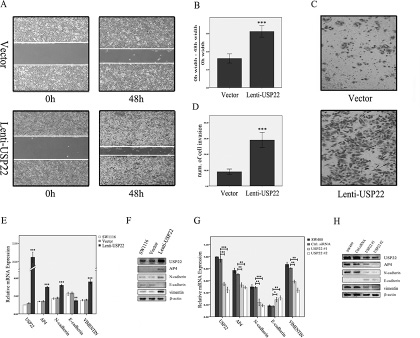 Figure 3: Effects of USP22 up- and down-regulation on CRC cells. (A–D). Scratch and transwell assays showed that migration and invasion abilities were significantly increased in USP22-up-regulated cells compared with the control. (E, F). Up-regulation of USP22 resulted in increased levels of N-cadherin, vimentin and AP4 and decreased E-cadherin expression as assessed by RT-PCR and western blot (WB) analysis. (G, H) RT-PCR and WB analysis demonstrated that N-cadherin, vimentin and AP4 expression were decreased and E-cadherin expression was increased in SW480 cells in which USP22 was down-regulated. Significance level as indicated: *p < 0.05; **p < 0.01; ***p < 0.001.