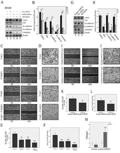 As shown in Figure 3, USP22 activates AP4 expression during EMT induction. To explore the role of AP4 in the promotion of EMT by USP22, we knocked down AP4 in USP22-down-regulated cells to detect the changes in the expression levels of key factors involved in EMT. First, we determined that AP4, N-cadherin, E-cadherin and vimentin expression levels were similar in AP4-down-regulated cells and USP22-down-regulated cells, findings consistent with those of a typical mesenchymal-epithelial transition, but USP22 expression remained unchanged in AP4-knockdown cells. The extent of mesenchymal-epithelial transition in double-gene (USP22 and AP4)-knockdown cells was greater than that in other cells (Figure 4A–4B). Similar changes in cell migration and invasion were observed in the scratch and transwell assays (Figure 4C–4F). These results indicate that both USP22 and AP4 participate in EMT and that AP4 may be a downstream molecule of USP22. To confirm these results, we down-regulated AP4 in lenti-USP22 cells (USP22-up-regulated cells) and detected the changes in USP22 and EMT marker expression. AP4 down-regulation partially reversed the increases in N-cadherin and vimentin expression levels induced by USP22 up-regulation; however, no changes in USP22 expression levels were observed (Figure 4G–4H). As shown in Figure 4I–4L, AP4 down-regulation resulted in markedly lower cell migration and invasion in affected cells than in lenti-USP22 control cells. These results suggest that EMT induction by USP22 requires functional AP4. Consistent with the above results, ChIP analysis revealed that USP22 binds the promoter region of AP4 (Figure 4M). Taken together, these results indicate that USP22 increases cell migration and invasion by inducing EMT by binding to the promoter of AP4 to activate its transcription.