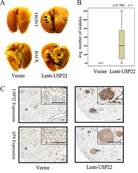 Figure 5: USP22 promotes lung metastasis of CRC cells in nude mice. (A) Vector control cells and lenti-USP22 cells were injected into the tail veins of BALB/C nude mice (n = 7 for each cell type). The lungs were resected 4 weeks later. The arrows indicate metastatic tumor nodules (dyed light yellow). (B) Quantification of metastatic nodules in the lungs per mouse. (C) IHC analysis revealed co-expression of USP22 and AP4 in consecutive sections of lung metastasis. Bars, 100 μm.