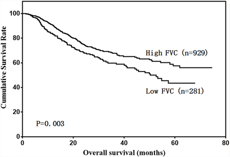 There were several limitations in our present study. First, it was a retrospective analysis limited to a single center. Multi-center studies are needed to verify the predictive value of FVC. Second, our patient cohort was not large enough, and small sample sizes can result in biased statistical analyses. Third, we did not evaluate the predictive value of FVC after radical gastrectomy. Postoperative pulmonary function may play roles in gastric cancer patient prognosis, and should be explored.