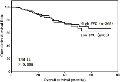 The prognostic value of preoperative pulmonary function has mainly been investigated in thoracic surgery [13, 14]. Guo, et al. reported that FVC was an independent risk factor for the prognosis of non-small cell lung cancer patients who underwent curative resection, and FVC<80% predicted poor patient survival [13]. Matsuzaki, et al. associated low forced expiratory volume 1 (FEV1)/FVC ratios with reduced overall and disease-free survival in lung cancer patients undergoing thoracic surgery. The same group found that the carbon monoxide diffusing capacity of the lung and the inspiratory capacity/total lung capacity ratio were associated with patient prognosis [14]. To the best of our knowledge, no previous study has associated preoperative pulmonary function with gastric cancer patient prognosis. Our study associated low FVC and MVV with poor prognosis in gastric cancer patients, and FVC was an independent prognostic predictor.