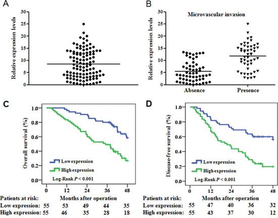 Figure 1: MiR-425-5p is up-regulated in HCC and is correlated with OS and DFS. (A) Quantification of mature miR-425-5p expression in 110 paired HCC and ANLT samples using qRT-PCR. (B) MiR-425 expression in HCC tissue with (n = 52) or without (n = 58) microvascular invasion. Expression was compared using ANOVA. (C and D) The OS and DFS of patients with high or low miR-425-5p expression.