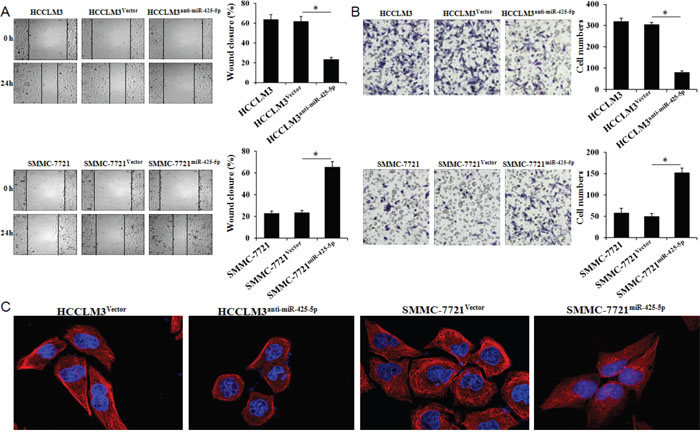 Figure 3: MiR-425-5p promotes HCC cell migration and invasion in vitro. Wound healing (A) and transwell (B) assays were performed to analyze the effects of miR-425-5p on HCC cell migration and invasion. The percentage of wound closure and percentage of cells that migrated through the transwell membranes are shown. *, P < 0.05. (C) Representative immunofluorescence images showing miR-425-5p-induced changes in HCC cellular morphology. Cell nuclei were stained with DAPI (blue), and the cytoskeleton was stained with actin-tracker FITC (red). Original magnification ×400.