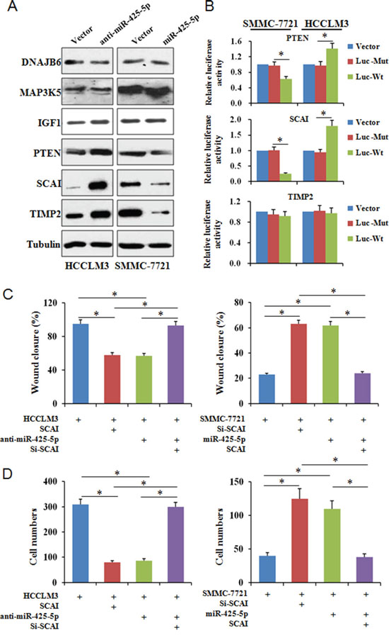 Figure 4: MiR-425-5p suppresses SCAI expression. (A) Analysis of candidate target gene expression by western blotting. (B) Reporter plasmids with wild-type or mutant 3’ UTR sequences of PTEN, SCAI, and TIMP2 were transfected into HCCLM3 and SMMC-7721 cells infected with anti-miR-425-5p or miR-425-5p lentiviruses and relative luciferase activity analyzed. To investigate whether SCAI expression either interfered with or mimicked the function of miR-425-5p, HCC cells were infected with lentiviral vectors expressing SCAI siRNA or SCAI to inhibit or restore SCAI expression, respectively. Wound healing (C) and invasion (D) assays were performed using the above cells. * P < 0.01.