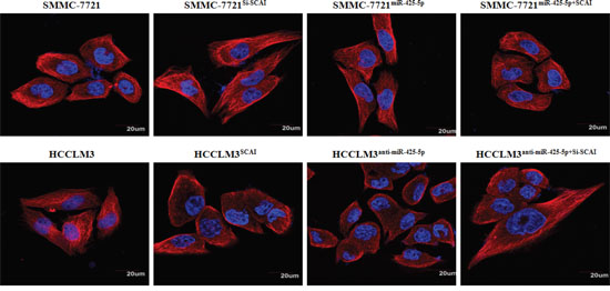 To examine whether miR-425-5p functioned through SCAI, we restored SCAI expression in HCCLM3anti-miR-425-5p and SMMC-7721miR-425-5p cells (Supplementary Figure 11). Wound healing and transwell assays revealed that silencing of SCAI mimicked the function of anti-miR-425-5p resulting in increased migration and invasion of HCCLM3 cells. Conversely, ectopic expression of SCAI blocked miR-425-5p-induced SMMC-7721 cell migration and invasion (Figure 4C and 4D, Supplementary Figure 8-10). Immunofluorescence analysis demonstrated that the morphological changes observed in HCCLM3anti-miR-425-5p and SMMC-7721miR-425-5p cells could be blocked by restoring SCAI expression (Figure 5).