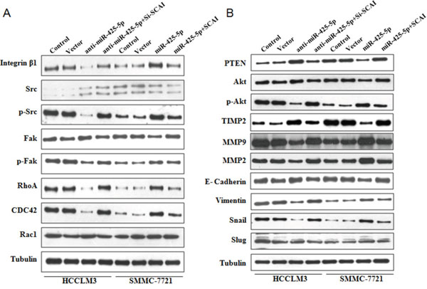 In conclusion, miR-425-5p is over-expressed in HCC and is correlated with poor patient prognosis. MiR-425-5p promotes HCC metastasis by suppressing SCAI- mediated dysregulation of the ITGB1-Fak/Src-RhoA/CDC42, PTEN-AKT, and TIMP2-MMP2/MMP9 signaling pathways. MiR-425-5p may therefore be a prognostic biomarker and a novel therapeutic target for HCC.