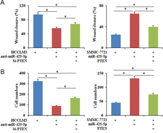 Figure 7: PTEN partially blocks the effects of miR-425-5p on the migration and invasion of HCC cells. Wound healing (A) and transwell (B) assays were performed to analyze the effects of PTEN on miR-425-5p-induced HCC cell motility and invasion. The percentage of wound closure and percentage of cells that migrated through the transwell membranes are shown. * P < 0.05.
