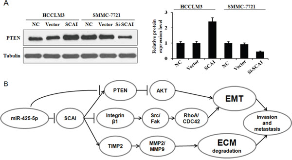 Figure 8: (A) SCAI stimulates PTEN expression. Western blot analysis of PTEN expression in response to ectopic expression or silencing of SCAI. The relative expression of PTEN in these cells is. (B) MiR-425-5p promotes EMT and ECM degradation in HCC through suppression SCAI-mediated deregulation of the ITGB1-Fak/Src-RhoA/CDC42, PTEN-AKT, and TIMP2-MMP2/MMP9 signaling pathways.