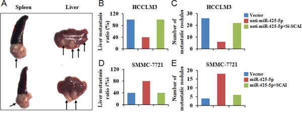 Figure 9: MiR-425-5p promotes metastasis in vivo. (A) Representative image of the tumor nodules observed at the primary (spleen) and metastatic (liver) sites. The black arrows indicate the locations of the primary tumor and metastatic nodules. (B, D) The number of mice with intrahepatic metastatic nodules. (C, E) The total number of intrahepatic metastatic nodules in each group.