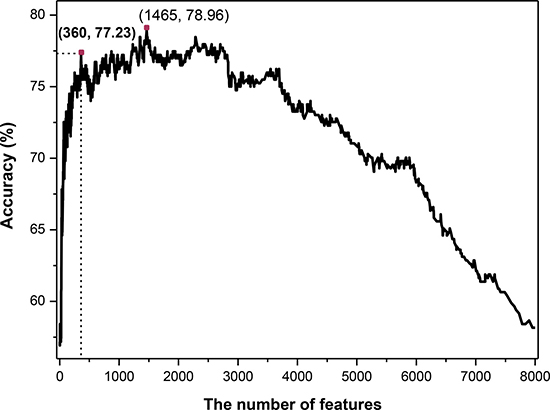 On the basis of binomial distribution, a novel feature selection technology was proposed in this work (see in section of Method). Then the SVM classifier was employed. The 7-fold cross-validated results (Figure 1) showed that the maximum overall accuracy of 78.96% was achieved when the top 1465 tripeptides was used. However, the total number of sample proteins is 404, which is much less than the number of feature dimension. For the purpose of establishing a credible and robust model, we should take into the number of features and the accuracy simultaneously. Ultimately, we chose the top 360 tripeptides which could produce an overall accuracy of 77.23% which was just slightly lower than the maximum accuracy (78.96%) produced by the top 1465 features. Therefore, the 360 tripeptide compositions served as the optimal feature subset to construct the final classifier in this study.