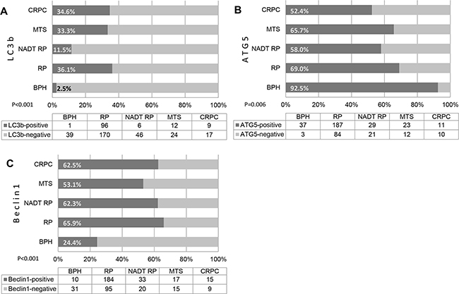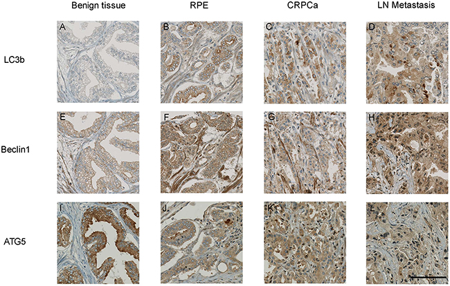 In the current study, we analyse the expression profile of the three main autophagy markers involved in autophagosome formation, LC3b, ATG5 and Beclin 1 in benign prostate tissue, localized PCa, CRPC and PCa metastases, respectively. Autophagy marker expression is further correlated with clinicopathological parameters including biochemical recurrence free survival (BCRFS), overall- (OS) and disease-specific survival (DSS).