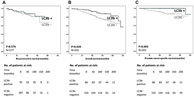 This is the first study investigating expression levels of the established markers of autophagy LC3b, Beclin 1 and ATG5 and their association with the solid clinical endpoint of survival in a representative cohort of PCa patients. LC3b, a major marker of autophagy, was significantly upregulated in adenocarcinomas of the prostate, in metastatic and in CRPC. Within the group of patients with localized PCa, who underwent radical prostatectomy, the absence of LC3b immunoreactivity was identified as a novel predictor of PCa-specific death after radical prostatectomy, which was independent of the well-established predictive factors Gleason score, tumour stage, and surgical margin status.
