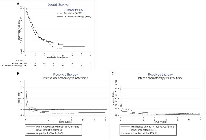 Figure 1: A. Kaplan-Meier curve for overall survival according to treatment. B. Royston and Parmar non-adjusted hazard ratio for overall survival after treatment with azacitidine vs. chemotherapy for each year after diagnosis. Before 15 days of follow-up, patients treated with intensive chemotherapy had a significantly higher risk of death compared to those that received azacitidine. At day 15, the risk of death was higher in the intensive-chemotherapy group compared to the azacitidine group (HR 2.22, 95%CI: 1.03-4.75). Beyond 15 days of follow-up, there was no significant difference in survival between the two groups. C. Royston and Parmar adjusted hazard ratio for overall survival after treatment with azacitidine vs. chemotherapy for each year after diagnosis. Before 1.6 years of follow-up, there was no significant difference in survival between the two groups. After 1.6 years, patients treated with intensive chemotherapy had a significantly reduced risk of death compared to those that received azacitidine (aHR 0.61, 95%CI: 0.38-0.99). Interaction between azacitidine vs. chemotherapy and the AML subtypes (t-AML, post-MDS, or post-MPN AML) was not significant, showing that the effect of azacitidine vs. chemotherapy was not significantly different according to AML subtypes. So, there is no indication to stratify the analysis on AML subtypes (Figure C was the same for t-AML, post-MDS, or post-MPN AML).