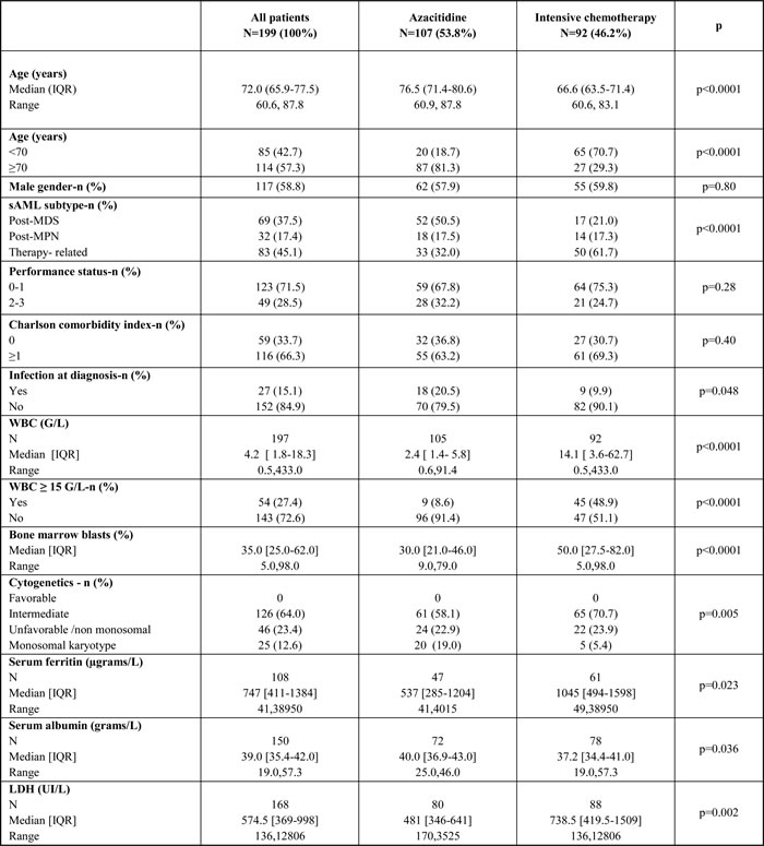 The median times from diagnosis to initiation of treatment were 0.7 month (interquartile range (IQR): 0.4-1.5) for azacitidine and 0.2 (IQR: 0.1-0.5) for chemotherapy (p < 0.0001). In the azacitidine group, patients received a median number of seven cycles (IQR, 2-15), using the standard 7-day scheme in 83% of cases. In the chemotherapy group, 60% of patients received a three-drug schedule that combined idarubicin, standard-dose cytarabine, and lomustine (Supplementary Table 1). Among the 92 patients who received intensive chemotherapy, 47 achieved complete remission (CR): 43 after a single induction course and four after a second induction regimen with high-dose cytarabine. Twenty patients were refractory to intensive chemotherapy and were then managed by best supportive care without receiving hypomethylating agents. One patient underwent HSCT in a refractory situation. Thirty-four CR patients were treated during the post-remission phase: 14 with at least one course of intermediate-dose cytarabine (≥1 g/m²) followed by HSCT given to 5 patients, 18 patients received a low-intensity regimen of chemotherapy, and 2 patients received HSCT without any consolidation.