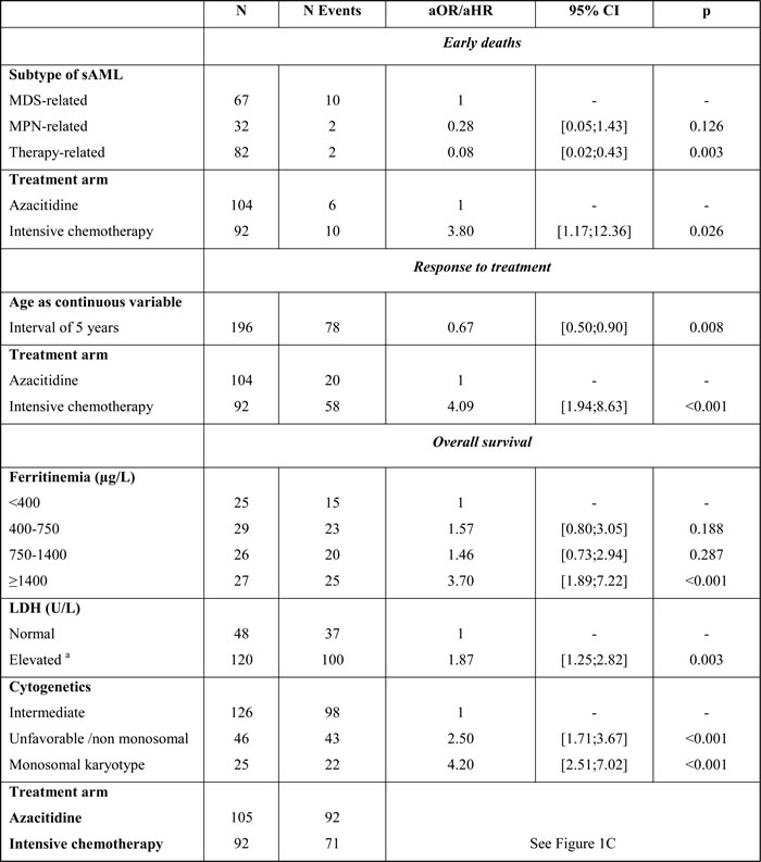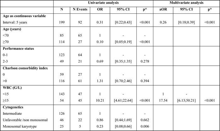 There were 10 (10.9%) early deaths in patients treated by chemotherapy and 6 (5.8%) in patients that received azacitidine (p = 0.193) (Table 2). Univariate analyses of the factors that influenced early death are shown in Supplementary Table 2. In the multivariate analyses, only AML subtype and type of treatment remained significantly predictive of early death, meaning that t-AML was associated with a lower risk of death (vs. post-MDS AML, adjusted OR 0.08, 95%CI: 0.02-0.43; p = 0.003) and chemotherapy was associated with a higher risk (vs. azacitidine, adjusted OR 3.80, 95%CI: 1.17-12.4; p = 0.026) (Table 4).