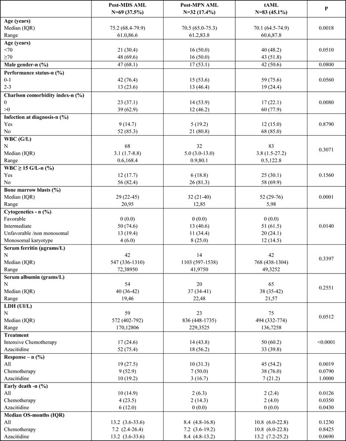 The characteristics of patients according to AML subtype are shown in Table 5. Patients with post MDS-AML were older and more often received azacitidine, whereas patients with post-MPN had a higher-risk cytogenetics, including the monosomal karyotypes. There was no interaction between the treatment arms and AML subtypes in all the multivariate analyses, indicating that the effects of treatment were similar for all three groups of AML.