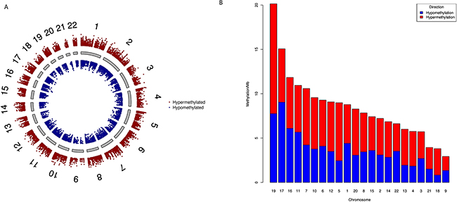 Figure 1: Genome-wide differential DNA methylation patterns in pancreatic cancer. (A) Difference in DNA methylation in all CpG sites passing false discovery rate (FDR) with Δβ ≥ 0.1. Δβ is weighted by T-statistics such that the distance from central core (grey) indicates increasing level of statistical significance. Chromosomes are shown in clockwise from 1 to 22; we did not use sex chromosomes (X or Y) in our analysis. (B) Chromosome wise DNA methylation frequency distribution in pancreatic cancer. For each chromosome we calculated hypermethylation and hypomethylation frequency per megabase pairs. We sorted chromosomes on the basis of DNA methylation/Mb. Chromosome 4, 5, 13 and 18 have two-fold higher hypermethylation frequencies.