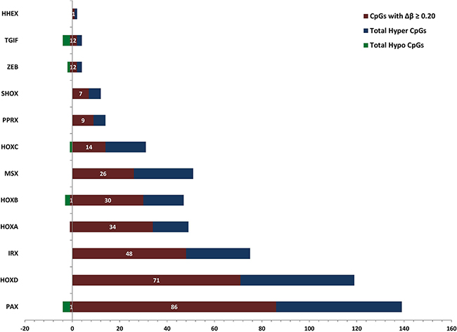 At the gene level, 7,405 genes have dm-CpGs at Δβ≥0.1 with a total of 1,351 genes have at least five or more dm-CpGs (Supplementary Data 1). Table 1 gives the details on the number of dm-CpG sites in different gene subregions and the number of genes corresponding to these probes. Table 2 has the list of top twenty hypermethylated and hypomethylated CpG site IDs with corresponding gene and chromosome associations. Results indicate that a number of HOX, zinc finger and other transcription factors are significantly differentially methylated in PCs.