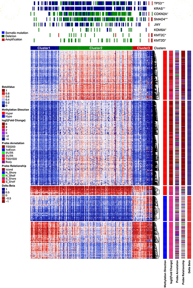 Given the increasing evidence on the role of epigenetics in cancer, we hypothesize that epigenetic landscape of PC tumors would be distinct compared to those of the normal tissues and that these epigenetic alterations can be correlated with the gene expression patterns in PCs. It has been shown that DNA methylation and gene expression of homeobox-containing genes, pancreas development genes and epigenetic regulatory genes play a vital role in PC [22]. In the current study, we carried out detailed analysis of the global differential methylation patterns in individual chromosomes, homeobox containing gene family and genes involved in epigenetic regulation, and clustered the patient population based on these patterns. We correlated the clustered groups with somatic mutation loads and copy number variations observed in important oncogenes and tumor suppressor genes. We also made detailed correlations between methylation patterns and gene expression levels using methylation data from different sub-regions of genes. Pathway and gene ontology (GO) enrichment analysis of differentially methylated and differentially expressed genes (DEG) enabled us to understand how changes in methylation affect the biological pathways involved in the progression of PC. We also examined the correspondence between pancreatic cancer-specific hypermethylated and hypomethylated distal enhancer probes and the known transcription factor binding motifs to obtain details about which site-specific transcription factors may be involved in the development and progression of PC.