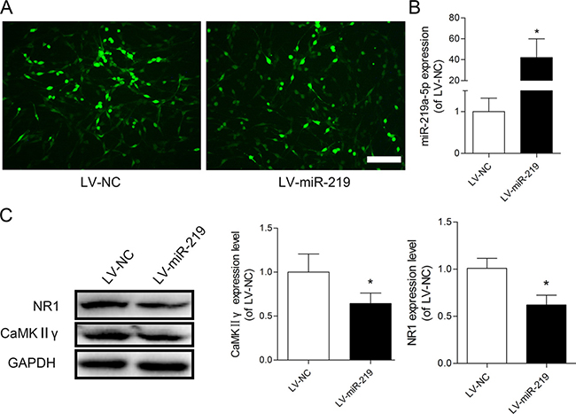 Figure 3: Overexpression of miR-219-5p decreased CaMKIIγ and NR1 expression in PC12 cells. (A) GFP was visualized in PC12 cells after transfection with lentiviral miR-219-5p (LV-miR-219) and lentiviral negative control (LV-NC), Scale bar = 100 μm. (B) Expression of miR-219-5p was examined by qRT-PCR in PC12 cells, 5 days after lentivirus infection. LV-miR-219 induced robust upregulation of miR-219-5p expression in PC12 cell (n = 3, *P < 0.05, compared with LV-NC group, by Student’s t-test). (C) Western blots showed the protein expression of CaMKIIγ and NR1 in PC12 cells after lentivirus infection. GAPDH was used as loading control. The expression of CaMKIIγ and NR1 was downregulated after PC12 cells were transfected with LV-miR-219 (n = 4, *P < 0.05, compared with LV-NC group, by Student’s t-test). All the data were expressed as mean ± SD.