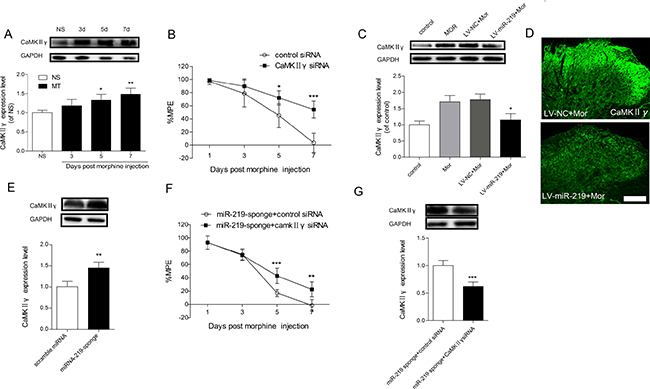 To gain further insight into the mechanism of miR-219-5p in morphine tolerance, we investigated the expression of CaMKIIγ in the context of morphine tolerance. Western blot showed that CaMKIIγ was gradually increased after intrathecal injection of morphine (Figure 4A). And we found that knockdown of spinal CaMKIIγ by siRNA intrathecal injection restored the antinociceptive effect of morphine (Figure 4B), suggesting knockdown of CaMKIIγ could attenuate morphine tolerance. To further explore the interaction between miR-219-5p and CaMKIIγ in morphine tolerance, we first examined whether overexpression of miR-219-5p affected CaMKIIγ expression. Overexpression of miR-219-5p reversed the increased expression of CaMKIIγ by intrathecal injection of LV-miR-219 rather than LV-NC (Figure 4C). Immunochemistry results were consistent with Western blot results (Figure 4D). Then we investigated the effect of downregulation of miR-219-5p on the expression of CaMKIIγ, we found downregulation of miR-219-5p by miR-219 sponge increased the expression of CaMKIIγ (Figure 4E). Moreover, intrathecal injection of CaMKIIγ siRNA partially abolished miR-219 sponge induced decline of %MPE after morphine injection (Figure 4F, 4G). Therefore, these data suggested that overexpression of miR-219-5p alleviated morphine tolerance by targeting CaMKIIγ.