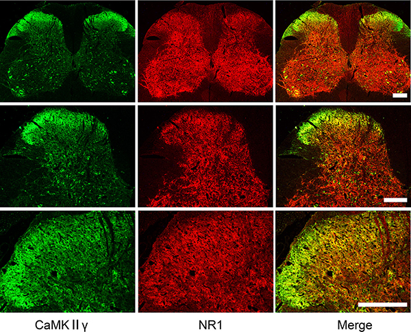 Figure 5: Localization of CaMKIIγ and NR1 in the spinal cord. Double immunofluorescence labeling showing abundant expression of both CaMKIIγ (green) and NR1 (red), and co-expression of CaMKIIγ and NR1(yellow) in the spinal cord under different levels of magnification. Scale bar = 200 μm.