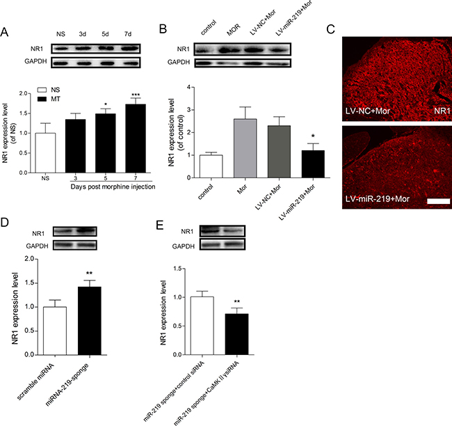 Figure 6: NR1 is involved in miR-219-5p mediated regulation of morphine tolerance. (A) Western blot analysis of changes in NR1 expression of the spinal cord (L4~L5) during morphine tolerance. GAPDH was used as a loading control (n = 3, *P < 0.05, compared with NS group, by one-way ANOVA followed by Bonferroni test). (B) miR-219-5p overexpression reduced NR1 expression in the spinal cord after chronic morphine treatment (n = 3, *P < 0.05, compared with LV-miR-219 +Mor, by one-way ANOVA followed by Bonferroni test). (C) Representative image of NR1 expression in spinal cord 10 days after lentivirus injection Scale bar = 100 μm. (D) Expression of NR1 protein in the spinal cord of naive rats on the day 7 after scramble miRNA or miRNA-219-sponge injection. (n = 4, **P < 0.01, compared with scramble miRNA group, by Student’s t-test). (E) Expression of NR1 protein in the spinal cord on the day 7 after injection of miR-219 sponge and CaMKIIγ siRNA in morphine treated rats. (n = 4, **P < 0.001, compared with miR-219 sponge + control siRNA group, by Student’s t-test). All the data were expressed as mean ± SD.