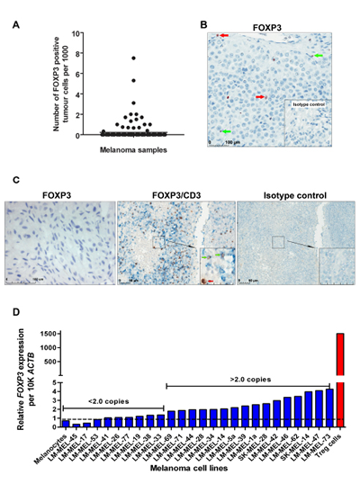 Figure 1: FOXP3 expression in advanced-stage melanoma. (A) Distribution of FOXP3 expression in 146 stage III and IV melanomas. (B) Representative image of FOXP3 staining in a melanoma sample using the anti-FOXP3 Ab10563 antibody or IgG isotype control antibody (bottom right panel). Tumor cells with large irregular-shaped nuclei are indicated with red arrows while Treg cells with smaller, denser nuclei are indicated with green arrows. (C) Staining of melanomas and cultured melanocytes with anti-FOXP3 Ab20034 (clone 236A/E7) antibody. Sections were double-stained with anti-FOXP3 (brown) and anti-CD3 (Ferrangi blue) (left panel) or IgG isotype control antibodies (right panel) to distinguish between FOXP3 expressing tumor cells and infiltrating T cells. (D) Detection of FOXP3 mRNA expression in a panel of human melanoma cell lines using quantitative real-time PCR.