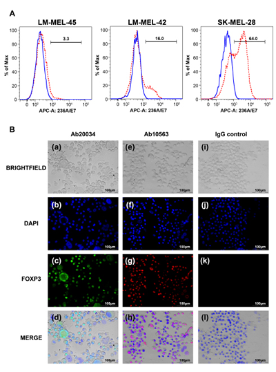 Figure 2: Establishment of FOXP3 over-expressing melanoma cell lines. (A) Detection of FOXP3 expression following over-expression in melanoma cell lines by staining with the anti-FOXP3 antibody (clone 236A/E7) and flow cytometry analysis. Blue solid lines represent FOXP3 expression in cells transfected with the pcDNA-empty vector and red dashed lines represent cells transfected with FOXP3. (B) Immunofluorescence staining of FOXP3 nuclear staining in a SK-MEL-28-FOXP3 clone. The anti-FOXP3 antibodies Ab20034 (a,b,c,d) and Ab10563 (e,f,g,h) were used to detect FOXP3 using Alexa-488 (green) and Alexa-555 (red)-conjugated secondary antibodies, respectively. FOXP3 nuclear staining is indicated by the red arrows. Panels i,j,k,h represents the cells stained with an IgG isotype control.