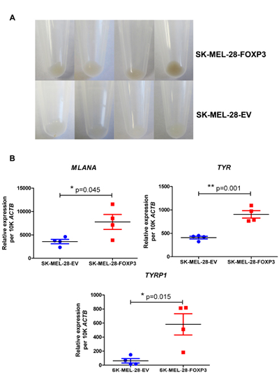 Figure 4: Effect of FOXP3 over-expression in SK-MEL-28 cells on melanoma cell pigmentation. (A) Increased pigmentation observed macroscopically in the four SK-MEL-28-FOXP3 clones compared to the SK-MEL-28-EV clones. (B) Expression of the melanoma-specific differentiation genes MLANA, TYR and TYRP1 in the four SK-MEL-28-FOXP3 clones (red) and SK-MEL-28-EV clones (blue). Values shown are the mean and SEM of the four clones