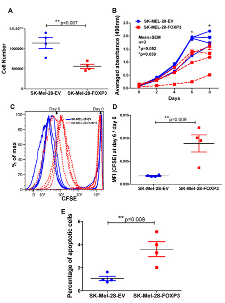 Finally, cells were stained with CFSE and the fluorescence intensity measured after 6 days. The mean intensity of CFSE staining was significantly lower in the four SK-MEL-28-EV clones (blue dots) compared to the SK-MEL-28-FOXP3 clones (red dots), consistent with more frequent cell division in the SK-MEL-28-EV clones (p<0.05) (Figure 5C). Collectively, these findings demonstrate that FOXP3 over-expression slows the growth of melanoma cells.