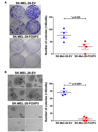 Figure 6: Effects of FOXP3 over-expression on melanoma cell clonogenecity. (A) Colony formation of the four SK-MEL-28-FOXP3 and EV control clones grown on plastic. 1,000 cells were seeded in 150mm x 15mm petri dishes and colony formation monitored over 3 weeks. Macroscopic view of the colonies stained with 0.1% Crystal Violet (left panel) and the number of colonies (≥40 cells) counted (right panel). (B) Colony formation of the four SK-MEL-28-FOXP3 and EV control clones grown in soft agar for 3 weeks. Brightfield images of the colonies from four SK-MEL-28-EV and SK-MEL-28-FOXP3 clones (left panel) and the number of viable colonies (≥40 cells) counted after staining with MTT (right panel). Values shown are the mean and SEM of a single representative experiment performed in triplicate.