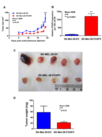 Figure 7: Assessment of growth of SK-MEL-28-EV and SK-MEL-28-FOXP3 clones as xenografts in vivo. (A) 9x105 cells from a representative SK-MEL-28-EV and SK-MEL-28-FOXP3 clone were injected into BALB/c nude mice and tumor growth monitored daily by calliper measurements (n=5). (B) Validation of FOXP3 mRNA expression in the resected tumors by quantitative real-time PCR (QPCR) (right panel). (C) Images of resected tumors and (D) weight of the SK-MEL-28-FOXP3 and SK-MEL-28-EV tumors measured following resection after sacrifice. The values shown are the mean and SEM of the five tumors.