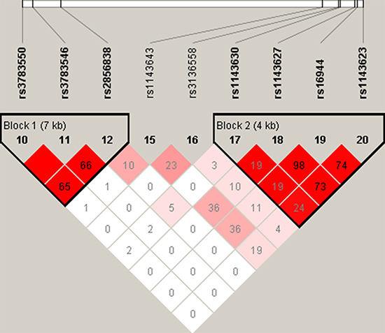 Figure 1: LD analysis of the association between all the SNPs of the IL-1A and IL-1B gene and ankylosing spondylitis.