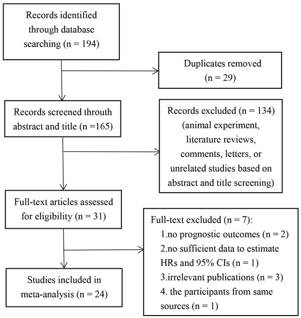 A total of 194 relevant publications were initially retrieved. Of these, 29 duplicates were removed, 134 publications were excluded because the studies were animal experiment, literature reviews, comments, letters, or unrelated studies based on the titles and abstracts screening. After reading the full text, 7 publications were excluded due to irrelevant publications, studies with overlapping case series or lack of sufficient data for analysis, Therefore, a total of 24 publications with 13719 patients were included [20-43]. All of these studies contained the required information and evaluated the correlation between PLR and the prognosis of CRC. Figure 1 presents a summary of the study selection process.