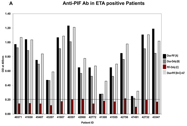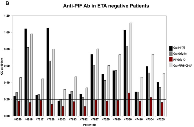 Figure 2: Analysis of anti-PIF antibody presence in RPL serum. Twenty eight patients categorized by the ETS assay as ETS+ or ETS- N = 14/group were tested for presence of anti-PIF antibodies. (see methods for assay details). A. Anti-PIF Ab in ETA positive Patients, B. Anti-PIF Ab in ETA negative Patients. The data showing the lack of anti-PIF antibody in both patient’s groups. The presence ova albumin in the assay leads to non-specific binding, but not observed when PIF tested alone. See Table 2 for statistical evaluation.