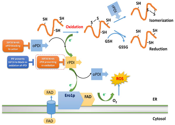 Figure 5: PIF mechanism of action on PDI oxi/reduction pathways. Small molecular inhibitor 16F16 and PIF act differently on oxidative protein folding exerted by PDI. The scheme is adopted by “Biochemical Basis of Oxidative Protein Folding in the Endoplasmic Reticulum” by Benjamin P. Tu et al. [66]. Protein disulfide isomerase (PDI), has two thioredoxin-like active sites, which both contain two cysteine residues and it is responsible for the formation of the disulfide bonds in unfolded eukaryotic proteins. By transferring the disulfide bond between these two cysteine residues onto the folding protein it is responsible for the folding protein oxidation, becoming reduced one (rPDI). Then PDI must be reoxidized so it can further catalyze the formation of disulphide bonds in unfolded proteins. This is carried out by an endoplasmic reticulum (ER) membrane-associated protein, Ero1p, which forms a mixed disulfide with PDI, which is resolved by a nucleophilic attack of the second cysteine residue in one of the active sites of PDI. As a result, oxidized PDI (oPDI) is obtained. Ero1p itself is oxidized by transferring electrons to molecular oxygen. As it is an FAD-binding protein, this transfer of electrons is strongly favored when Ero1p is bound to FAD. In misfolded proteins, incorrect disulfide bonds are rearranged by reduction, which is carried out by oxidation of reduced glutathione (GSH) to oxidized glutathione (GSSG). 16F16 and PIF predominant binding mode of action shown. ER, endoplasmic reticulum; PDI, Protein disulfide isomerase; rPDI, reduced PDI; oPDI, oxidized PDI.