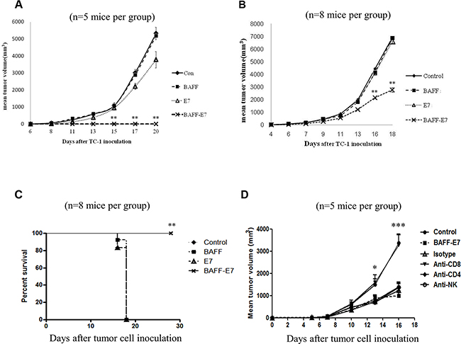 Figure 2: Protective and therapeutic effects of the BAFF–E7 DNA vaccine. (A) C57BL/6 mice (five per group) were immunized with 2 μg of different DNA constructs three times at 5-day intervals. Five days after the final vaccination, mice were subcutaneously injected with TC-1 tumor cells (105/mouse). Protective effects of the DNA vaccines were shown by the tumor rejection. Tumor volume of mice treated by BAFF-E7 DNA vaccine was significantly smaller than that of other groups (p<0.005, BAFF-E7 versus with other groups). (B) C57BL/6 mice (eight per group) were subcutaneously injected with TC-1 tumor cells (105/mouse). Four days after tumor inoculation, mice were vaccinated with 2 μg of DNA vaccine three times at 5-day intervals. Therapeutic effects of the DNA vaccines were monitored from day 4 after inoculation. The line graph illustrates that the tumor volume in mice treated by BAFF-E7 DNA vaccine was significantly smaller than that of mice treated by the others (p<0.005, BAFF-E7 versus other groups). (C) Survival curve of the tumor-bearing mice treated by DNA vaccines. The results implied that BAFF-E7 DNA vaccine possesses preventive and therapeutic effects against TC-1 tumors and can sustain the survival of the treated mice longest. (D) C57BL/6 mice were injected with the same number of TC-1 cells and were vaccinated with 2 μg of DNA vaccine three times at 5-day intervals four days later after tumor inoculation. The 100μg of neutralizing antibody against CD8 T cells, CD4 T cells and NK cells were started to administer at the same day of first vaccination to the end of this assay with 2-day intervals. Mice without any treatment were set as control group. The results showed that administration of mouse CD8 neutralizing antibodies abrogated the anti-tumor effect, but not CD4 and NK neutralizing antibody (P<0.05 at day 13 and P<0.0001 at day 16). This implied CD8+ T cells contribute to the anti-tumor effect of BAFF-E7 DNA vaccine treatment. Error bar of each chart represents the standard error.*P<0.05, **P< 0.005, ***P<0.0001.