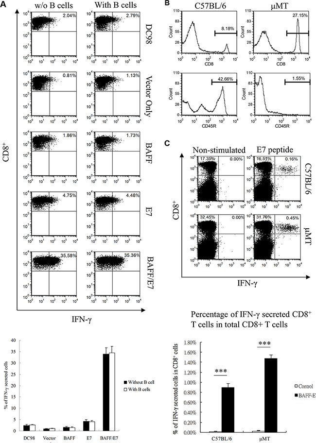 Figure 3: Role of B cells in the BAFF–E7 vaccine immune response. (A) DC98 cells were transiently transfected with different DNA constructs using the Amaxa nucleofection system. One day after electroporation, 1 × 105 transfected DC98 cells were co-cultured with or without 1 × 106 C57BL/6 mouse B cells for another 24 h. At day 3, HPV-16 E7-specific T cells were added to the cell mixture with 1 μg/well of GolgiPlug. The proportion of IFN-γ-secreting cells was analyzed and depicted. Representative graph demonstrates that the presence of B cells did not significantly influence the activation of E7-specific CD8+ T cells. (B) Proportion of CD8+ and CD45R+ cells in the splenocytes from the C57BL/6 and μMT mice. only B cells, but not T cells, were lost in μMT mice. (C) C57BL/6 and μMT mice (five per group) were immunized with 2 μg of BAFF-E7 three times at 5-day intervals. Splenocytes from the mice were restimulated ex vivo with the E7 peptide and then characterized for E7-specific CD8+ T cells through analysis of intracellular IFN-γ staining cells. Splenocytes obtained from control and BAFF–E7 groups without peptide stimulation represented the background control. The percentage of E7-specific CD8+/IFN-γ+ double-positive T cells in all CD8+ T cells was shown as histogram. Representative graph shows that CTL-specific immunity can be generated by the chimeric BAFF-E7 DNA vaccine in both B-cell possessed or deficient mice (p<0.0001 BAFF-E7 versus control in wild type mice; p<0.0001, BAFF-E7 versus control in B cell deficient mice). Error bar in each chart represents the standard error. ***p < 0.0001.