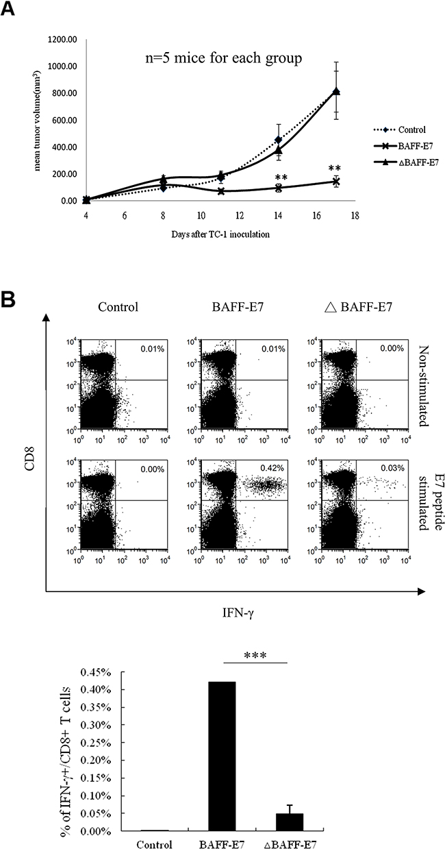Figure 5: Antitumor effect of the BAFF-E7 and ΔBAFF-E7 DNA vaccines in vivo. (A) C57BL/6 mice (five per group) were first subcutaneously injected with TC-1 tumor cells (105/mouse). Four days after tumor inoculation, mice were vaccinated with 2 μg of DNA vaccine per mouse, three times at 5-day intervals. Tumor volume was measured starting from day 4 after tumor inoculation. The line graph illustrates that the ΔBAFF-E7 DNA vaccine cannot significantly inhibits the growth of TC-1 cells (Day 14, p<0.005, BAFF-E7 versus ΔBAFF-E7; day 17, p<0.005, BAFF-E7 versus ΔBAFF-E7). (B) Splenocytes from five mice in each group were pooled and restimulated ex vivo with the E7 peptide and then characterized for E7-specific CD8+ T cells through analysis of intracellular IFN-γ staining cells. Splenocytes from the control, BAFF, E7, and BAFF–E7 groups without peptide stimulation served as the background control. Representative graph shows that ΔBAFF-E7 DNA vaccine did not induce high percentage of E7-specific CD8+ T cells as BAFF-E7 did. (p=0.0004, BAFF-E7 versus ΔBAFF-E7). The result indicates that the property of ER-accumulation by fusing E7 to the full length of BAFF protein is critical for E7-specific CD8+ CTL activation and antitumor effects. Error bar in each chart represent standard error. **p < 0.005; ***p< 0.0005.