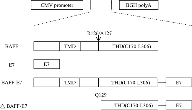 Figure 6: Schemes of the DNA vaccine constructs. HPV-16 E7 gene and full length of the BAFF, BAFF-E7, and ΔBAFF–E7 genes were inserted under the control of the CMV promoter in the pcDNA3.1 vector. TMD: transmembranous domain. THD: TNF homology domain. R126/A127: furin cleavage site.