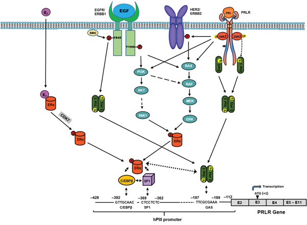Our recent studies revealed upregulation of the PRLR induced by endogenous and exogenos prolactin (PRL) through its receptor in the absence of estradiol in MCF-7 and T47D-cells where unliganded-ERα, JAK2/STAT5, mitogen-activated protein kinase (MAPK) and PI3K pathways were found to have essential roles. Phospho- ERα associates with the C/EBPβ-SP1 as complex at the PRLR hPIII promoter. JAK2- activated STAT5a and b (phospho-forms) associate as tetramer of homodimers or heterodimers with a functional GAS element in the non-coding exon 1 (hE13) corresponding to the hPIII promoter [13]. This exon was found in our previous studies to be required for the transcriptional activity of the hPIII promoter (Figure 1A, left) [15, 16]. Other recent studies have indicated a role for paracrine EGF via EGFR/ERBB1 independent of estrogen and prolactin in the transcriptional activation of PRLR gene expression. Unliganded ERα and STAT5b, which are both phosphorylated by EGF-induced activation of EGFR/ERRB1 through separate independent mechanisms, are both required in the PRLR activation of gene expression by EGF [19]. Of major relevance were our findings whereby interaction of ERα with STAT5 at the promoter was found to be required for association of phospho-ERα to the complex with consequent induction of the PRLR gene by PRL or EGF. These findings were indicative of STAT5 as stabilizing factor on unliganded ERα association to the complex at the PIII promoter.