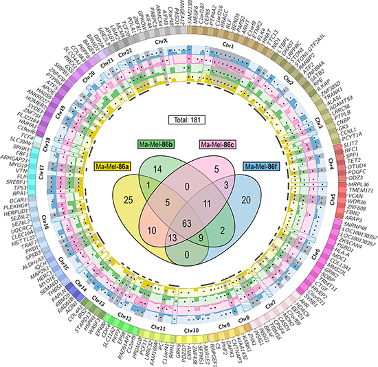 Figure 1: Localization of potentially immunogenic mutations in Ma-Mel-86. Filtering according to the scheme in Supplementary Figure 2B resulted in a list of 181 somatic expressed non-synonymous SNS. Their distribution to the four melanoma cell lines is depicted in the Venn diagram (center). The 178 affected genes are listed on the outer ring of the Circos plot sorted by their genomic coordinates. Genes listed twice carried two different mutations (LOC100130357 und SEZ6L2) or two isoform-specific amino acid exchanges caused by the same mutation (INSIG1). Gene expression levels are given as normalized read counts (means of three replicates) in the bar graphs determined from the RNA-seq data of Ma-Mel-86a (yellow), -86b (green), -86c (magenta) and -86f (blue). Expression values above 2,000 are indicated with shading. Black dots on the bar graphs mark which cell line carried the mutations and mutations present in all four tumor cell lines are gray-shaded. Marks below the bar graphs indicate which SNS led to at least one peptide candidate with a predicted HLA class I binding affinity of ≤ 500 nM (NetMHC) and a percentile rank of ≤ 10 (IEDB).
