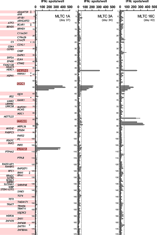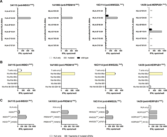Eight independent MLTCs were generated from PBMCs or CD8+ T cells isolated from blood donated by the patient (Table 2). The lymphocytes were stimulated with the melanoma cell lines Ma-Mel-86a (MLTCs 1A, 3A and 4A), -86c (MLTCs 1C, 2C, 7C and 15C) or with HLA transfectants of Ma-Mel-86c (MLTC 16C). After three to eight weekly stimulations (Table 2), CD8+ MLTC responders were tested with IFNγ ELISpot assays for recognition of the 196 mutated candidate peptides (Supplementary Table 1). 86cNP peptides were analyzed with MLTC 16C responders only and indel-derived peptides could not be tested with MLTC 15C and MLTC 1A due to lack of material. In total, we found eleven SNS-derived peptides to be reproducibly recognized by up to three of the MLTCs with average spot counts above the threshold (mean background count plus three SD, Figure 2). The responsive MLTCs 1A, 3A and 16C had been stimulated with either Ma-Mel-86a or HLA-reconstituted Ma-Mel-86c. None of the 86cNP peptides were recognized (Figure 2). None of the MLTCs stimulated with unmodified Ma-Mel-86c cells showed peptide reactivity (not shown). And no reactivity was observed against any of the indel-derived peptides (not shown).