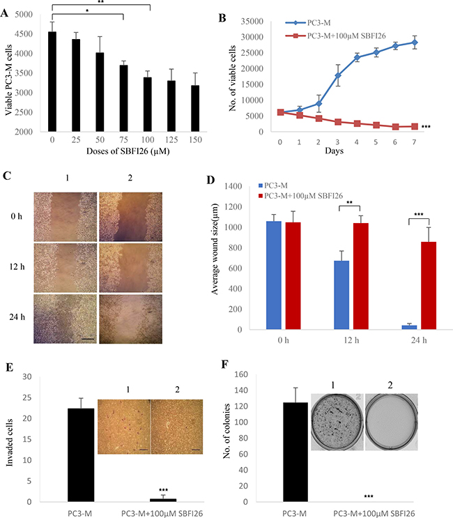 Figure 2: Inhibitory effect of SBFI26 on proliferation, migration, invasion and anchorage-independent growth of the androgen-independent PC3-M prostate cancer cells. (A) Determination of the optimal inhibitory concentration of SBFI26 at which the maximum suppression of cell growth is achieved. MTT assay was performed to measure the viable PC3-M cell numbers of the control (untreated) and those treated with different concentrations of SBFI26 for 24 h. (B) Inhibitory effect of 100 μM SBFI26 on proliferation of PC3-M cells over the 7day experimental period. (C) Representative photos of the wound healing assay. PC3-M cells were grown in 6-well plates to form a monolayer. Scratches were made using 1 mL sterile pipette tip. Cell migration capacity was measured by the reduction in wound size in control (1) and in cultures treated with 100 μM SBFI26 (2) observed at 0, 12 and 24 hours after treatment. The scale bar is 250 μm. (D) Average wound sizes (μm) of the control PC3-M and cultures treated with 100 μM SBFI26 observed at 0, 12 and 24 hours after treatment. Data was collected by measuring image of the wound space and analyzed by ImageJ software (National Institutes of Health). (E) Number of invading cells from the control PC3-M cells (1) and cultures treated with 100 μM SBFI26 (2) for 24 h after different treatments. Results (mean ± SE) are obtained from three separate measurements. Scale bar is 250 μm. (F) Colonies produced by the control PC3-M cells (1) and cultures treated with 100 μM SBFI26 (2) in soft agar 2 weeks after the different treatments. Results (mean ± SE) are obtained from three separate plates in each treatment. The inserted picture was a representative plate from each of the 3 treatments. All in vitro results were subjected to 2-tailed unpaired Student’s t test and *P < 0.05; **P < 0.001; ***P < 0.0001.