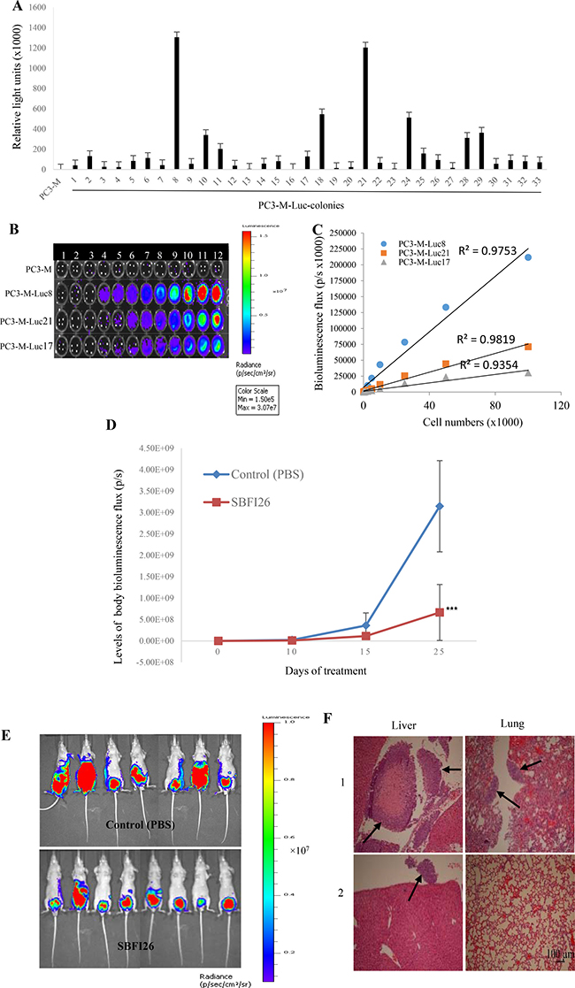 PC3-M cells were stably transfected with the luciferase vector and the 2 transfectant colonies that generated high bioluminescence signals were picked and named PC3-M-Luc8 and 21, respectively (Figure 3A). Further measurement with the IVIS image system showed that PC3-M-Luc8 produced the highest level of bioluminescence signal (Figure 3B) and there was a correlation between total flux and the number of labelled cells (R2 = 0.98) (Figure 3C). Luciferase-labelled PC3-M-Luc8 were implanted orthotopically into the dorsolateral side of the prostate of each of 2 groups of nude mice that were then intraperitoneally injected daily with PBS and SBFI26, respectively, for 25 days. At day 25, there was a massive decrease in bioluminescence signal (p/sec/cm2) in SBFI26 (6.66 × 108) treated group in comparison with the control (31.5 × 108). On the basis of bioluminescence, our results showed about 4.9-fold suppression in tumour masses by SBFI26 over those of control group (Student’s t test, P < 0.0001) (Figure 3D). In the control group, 7/7 (100%) mice produced metastases. In the group treated with SBFI26, 4/8 (50%) of mice produced visceral metastasis. A suppression of 50% in metastasis incidence was seen when compared to the control group (Figure 3E). Histological staining showed that all mice developed metastases in the control group, mainly in the liver and lung. In the SBFI26 treated group, half of the mice developed liver metastases with no metastasis in the lung. One representative stained slide from each group/organ is shown in Figure 3F.