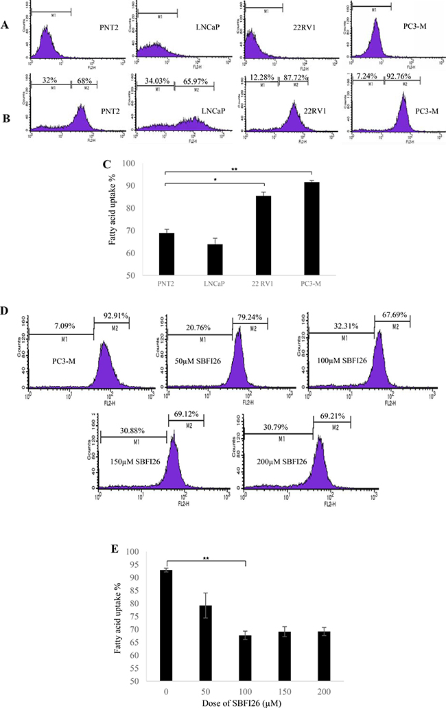 Figure 5: Fatty acid uptake of different prostate epithelial cell lines and inhibitory effect of SBFI26 in PC3-M cells. (A) Representative histograms for unstained PNT2, LNCaP, 22RVI and PC3-M cells without adding BODIPY-labelled fatty acid. The marker M1 highlights negative peaks of the subclass control. (B) Representative histograms for fluorescence of stained PNT2, LNCaP, 22RVI and PC3-M cells 30min after adding BODIPY-labelled fatty acid and the marker M2 is placed to the right of M1 to highlight positive events (total percentage of cells with BODIPY-labeled fatty acid). (C) Percentages of cells taking up BODIPY-labelled fatty acid from different prostate epithelial cell lines. (D) Representative histograms for fatty acid uptake of PC3-M cells at a fixed concentration of BODIPY-labelled fatty acid with different concentrations of SBFI26. M1, unstained cells; M2, stained cells. (E) Percentages of cells with fatty acid uptake from PC3-M control (untreated) and those treated with different concentrations of SBFI26 for 30min with a fixed concentration of BODIPY-labelled fatty acid. Fluorescence intensity of each cell line was measured with an EPICS XL Cytometer (Beckman) at 570 nm and data analysis was performed with SYSTEM II™ Software. Values were plotted as mean ± SE (error bars). The differences between the control and the experimental groups were assessed by 2-tailed unpaired Student’s t test. *P < 0.01; **P < 0.001.