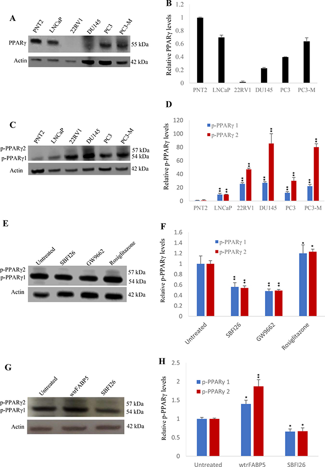 Figure 6: Effects of SBFI26 on levels of biologically active PPARγ or phosphorylated PPARγ (p-PPARγ1 and p-PPARγ2) in prostate cancer cells. (A) Western blot of PPARγ expression in benign and malignant prostate epithelial cells. (B) Quantitative assessment of levels of PPARγ in benign and malignant prostate epithelial cells. The level of PPARγ in the benign prostate PNT2 cells was set at 1; levels in the other prostate cell lines were obtained by comparison with that in PNT2. (C) Western blot analysis of p-PPARγ1 and p-PPARγ2 in benign and malignant prostate epithelial cells. (D) Quantitative assessment of the levels of p-PPARγ1 and p-PPARγ2 in prostate cells. Levels of p-PPARγ1 and 2 in benign PNT2 cells were set at 1; levels in the other prostate cells were obtained by comparison with those in PNT2. (E) Effect of 24 h treatments with SBFI26, PPARγ antagonist (GW9662) and PPARγ agonist (Rosiglitazone on levels of p-PPARγ1 and 2 in PC3-M cells. (F) Quantitative assessment of p-PPARγ1 and 2 levels in PC3-M cells after treatments with SBFI26, GW9662 and Rosiglitazone. Levels of both p-PPARγ1 and 2 in untreated PC3-M cells were set at 1; levels in the other treated cells were obtained by comparison with those in untreated PC3-M. (G) Effect of 24 h treatments with wtrFABP5 and SBFI26 on levels of p-PPARγ1 and 2 in 22RV1 cells. (H) Quantitative assessment of levels of p-PPARγ1 and 2 in 22RV1 cells. Levels of both p-PPARγ1 and 2 in the control were set at 1; levels in the other treated cells were obtained by comparison with those in controls. For each Western blot, anti-β-actin was incubated with the same blot to normalize for possible loading errors. Results (mean ± SE) were obtained from 3 separate experiments and the differences between the control and the treatments in each experiment were assessed by 2-tailed unpaired Student’s t test. *P < 0.05; **P < 0.001.