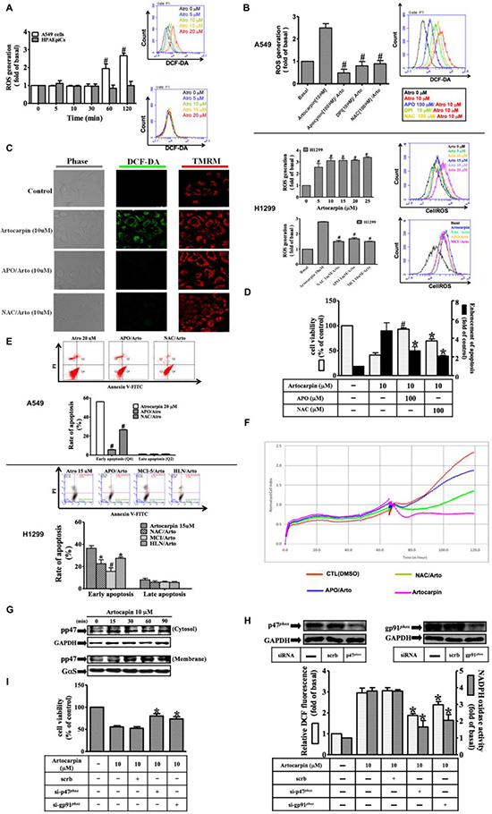 Figure 2: Artocarpin-induced activation of NADPH oxidase and generation of ROS triggers apoptosis in tumor cells. Time dependence of artocarpin-induced ROS generation and p47phox activation are shown. (A) A549 cells and HPAEpiCs were stained with DCF-DA (10 μM) and treated with artocarpin for different periods of time. The fluorescence intensity was then determined. (B) A549 and H1299 cells were pretreated with DPI (10 μM), APO (100 μM), or NAC (100 μM) for 1 h and then stimulated with 10 μM artocarpin for 120 min. ROS generation was determined via fluorescent plate reader and flow cytometry. (C) Cells were stained with DCF-DA (10 μM) and TMRM (10 μM) and then pretreated with APO or NAC for 1 h before artocarpin administration. The ROS generation (green color) and mitochondrial membrane potential (red color) were detected via confocal microscope.(D–F)A549 cells were pretreated with APO or NAC for 1h, and then incubated with 10 μM artocarpin for 24h. Cytotoxicity was determined using MTT assay, flow cytometry(cells stained with Annexin-V and PI) and real-time cytotoxicity assay. (G) The membrane (ME) and cytosolic (CE) fractions were collected and subjected to Western blot analysis with an anti-phospho-p47phox antibody. (H)A549 cells were transfected with siRNAs for scrambled,Nox2 (gp91phox) or p47phox, and then treated with 10 μM artocarpin for 120 min. ROS generation (open bars) and Nox activity (shaded bars) were determined via ELISA reader. (I) A549 cells were transfected with siRNAs of Nox2 (gp91phox) or p47phox, and then treated with 10 μM artocarpin for 24 hr. Cytotoxicity was determined using MTT assay. (A–I) are means ± SEM. *P < 0.05, #P < 0.01, compared with the control group.